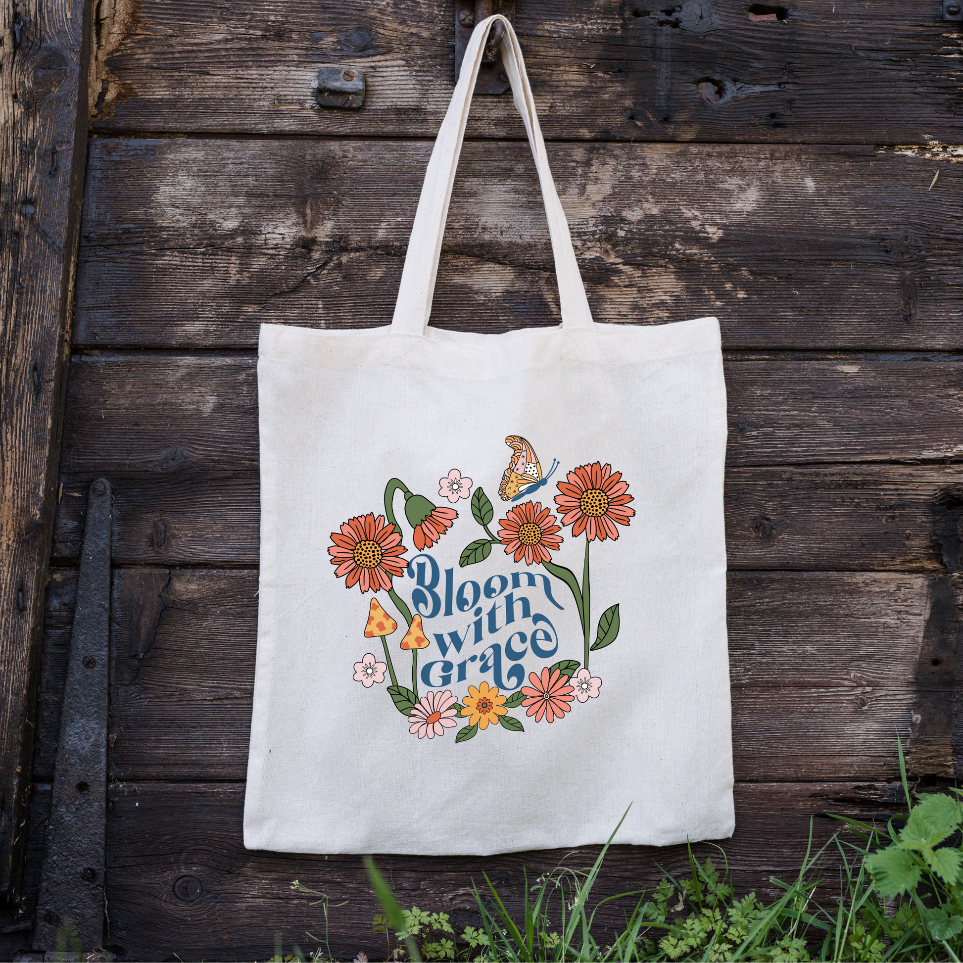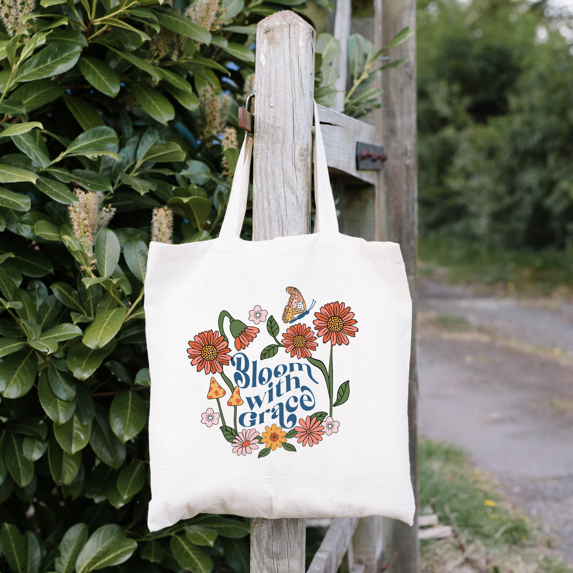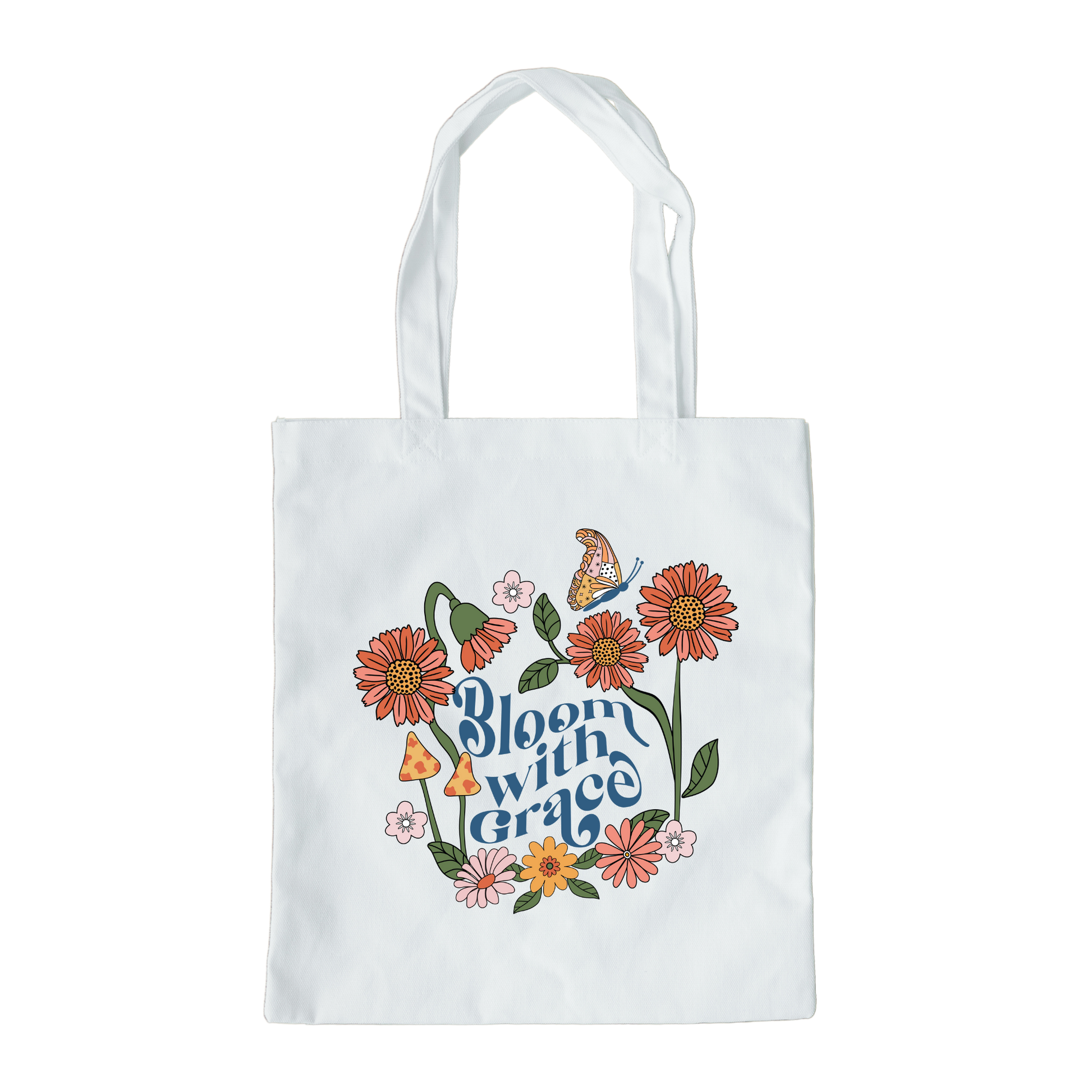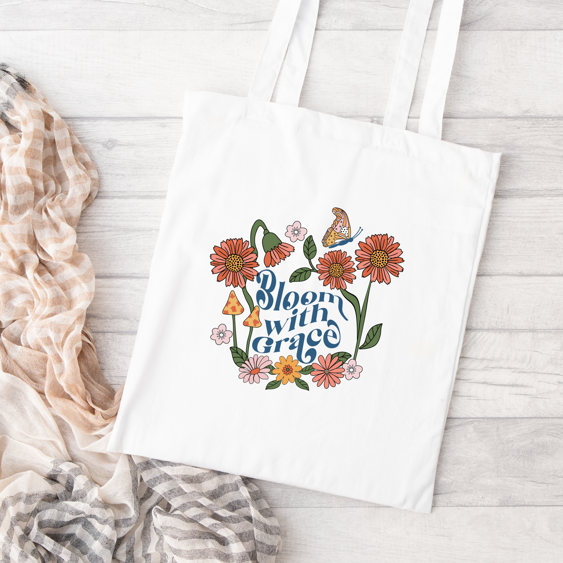 Bloom With Grace Tote Bag, Flower Tote, Floral Tote Bag, Reusable Bag, Motivation Gift Tote Bag