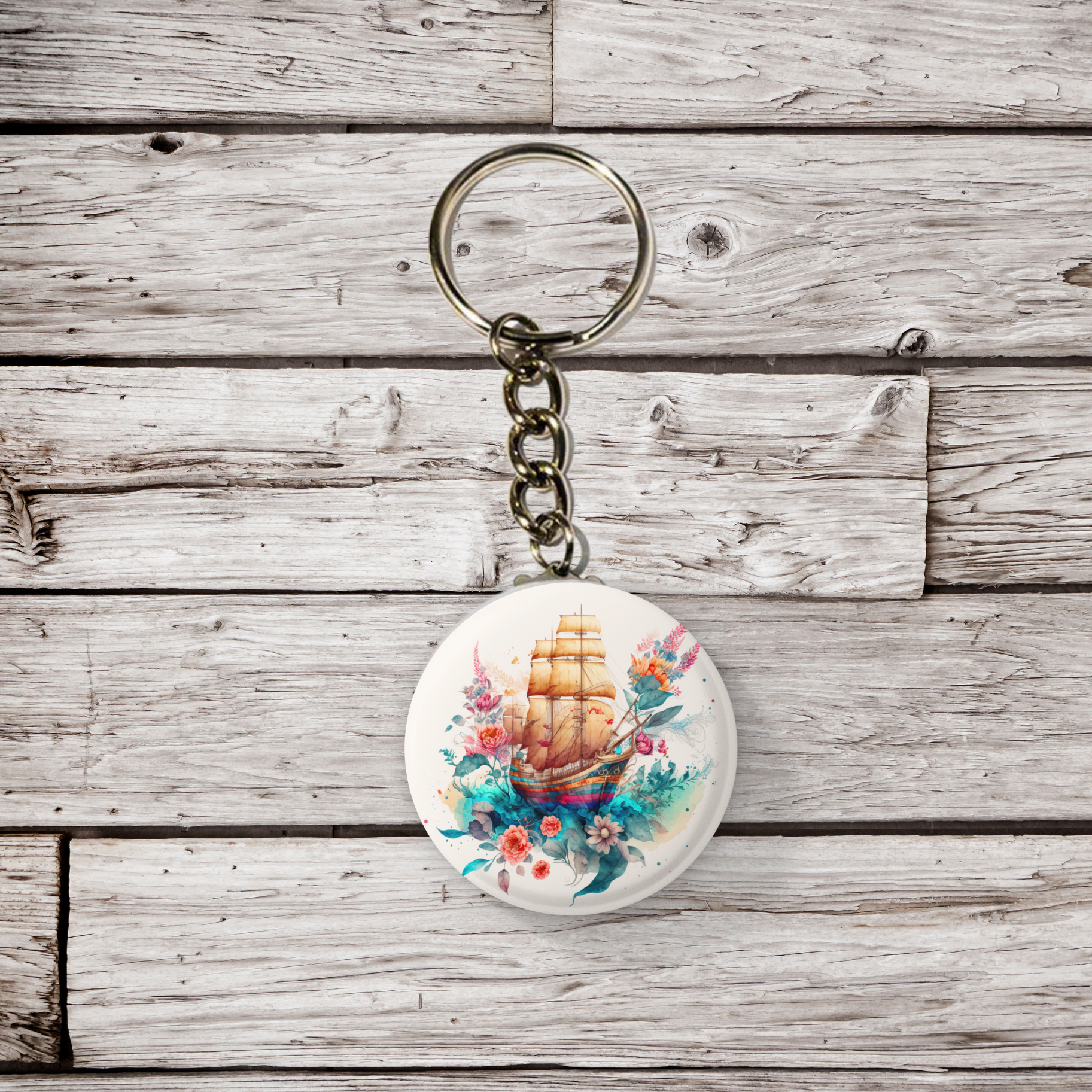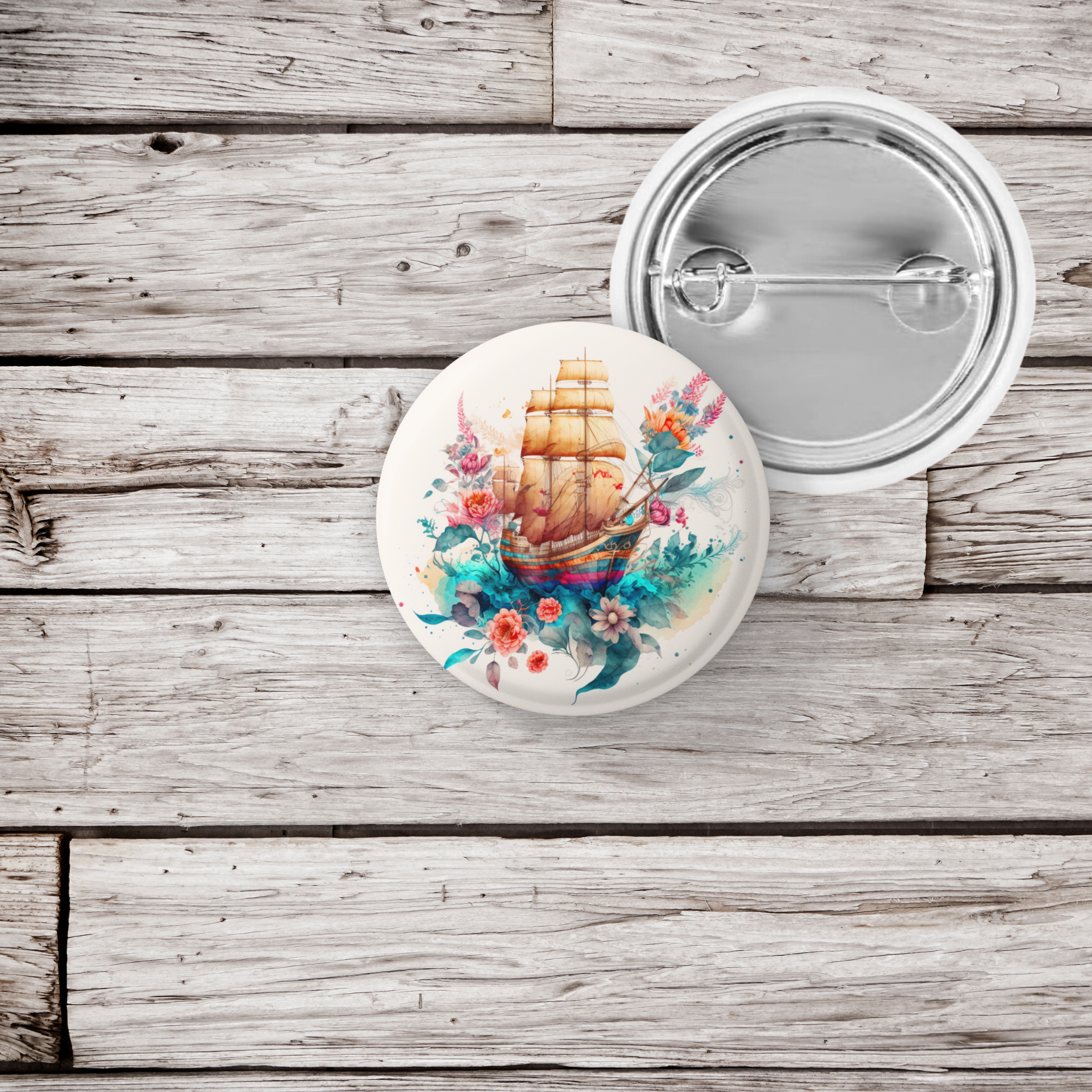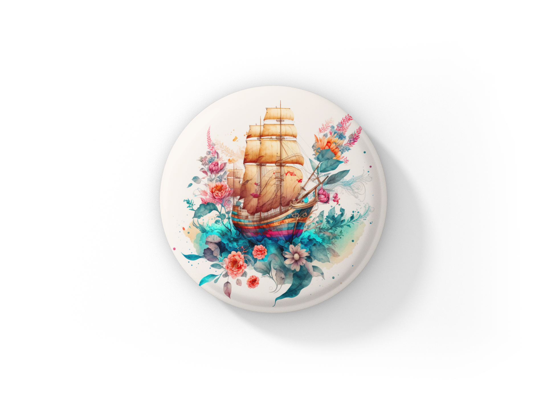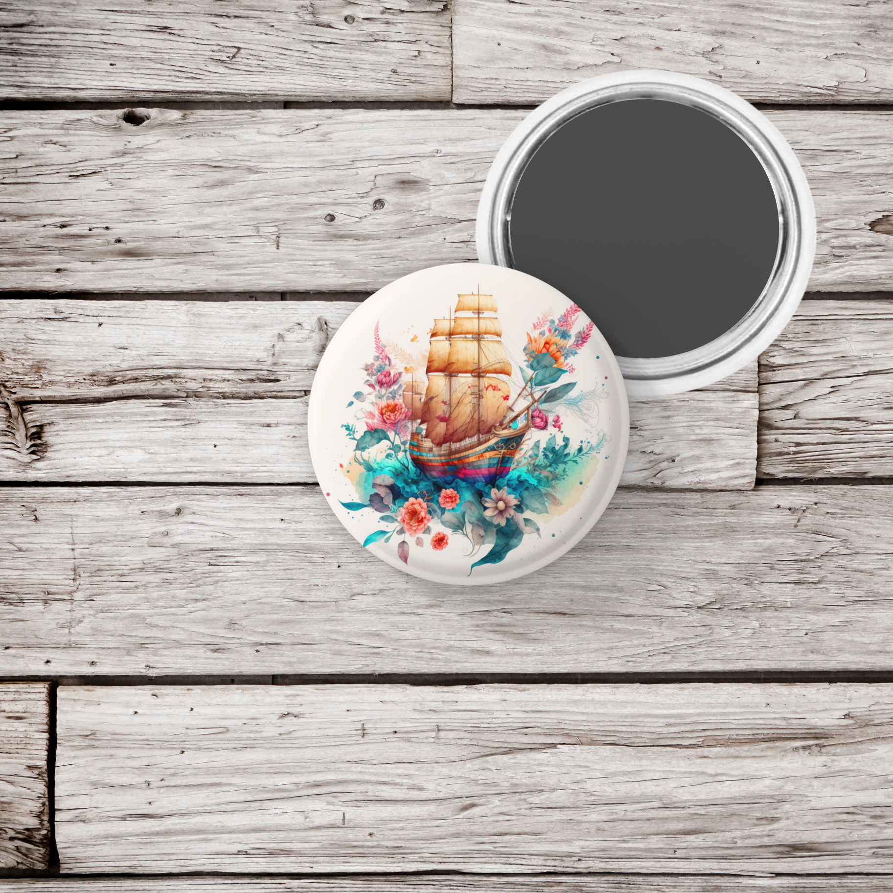 Floral Pirate Ship Pin Back Button, Magnet, Keychain
