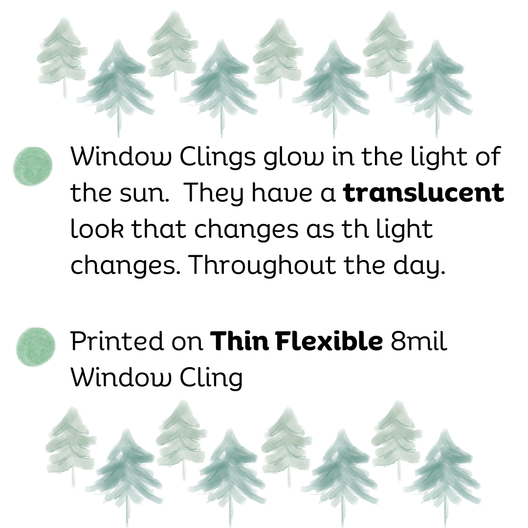 Window Clings are printed on thin flexiable clear film that glows in the light of the sun. Window clings have a translucent look that changes as the light changes throughout the day.
