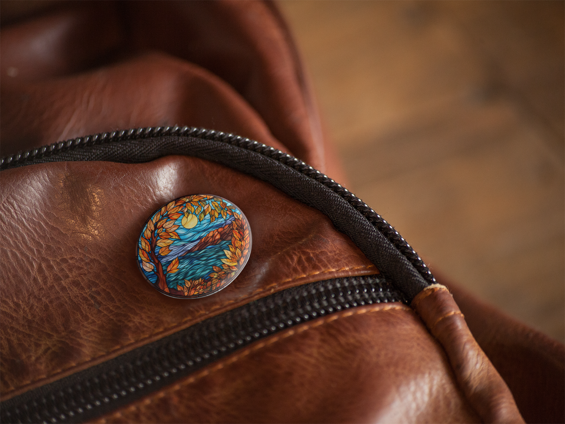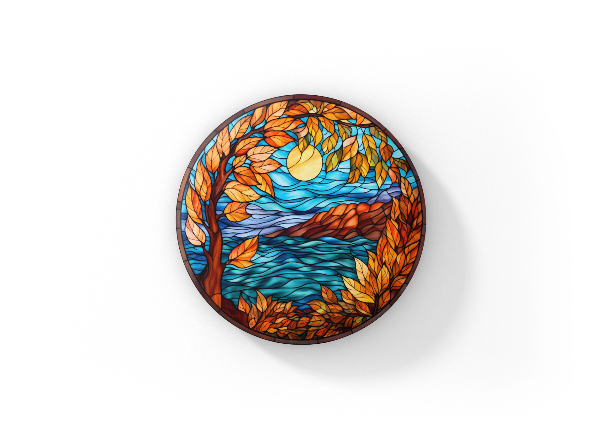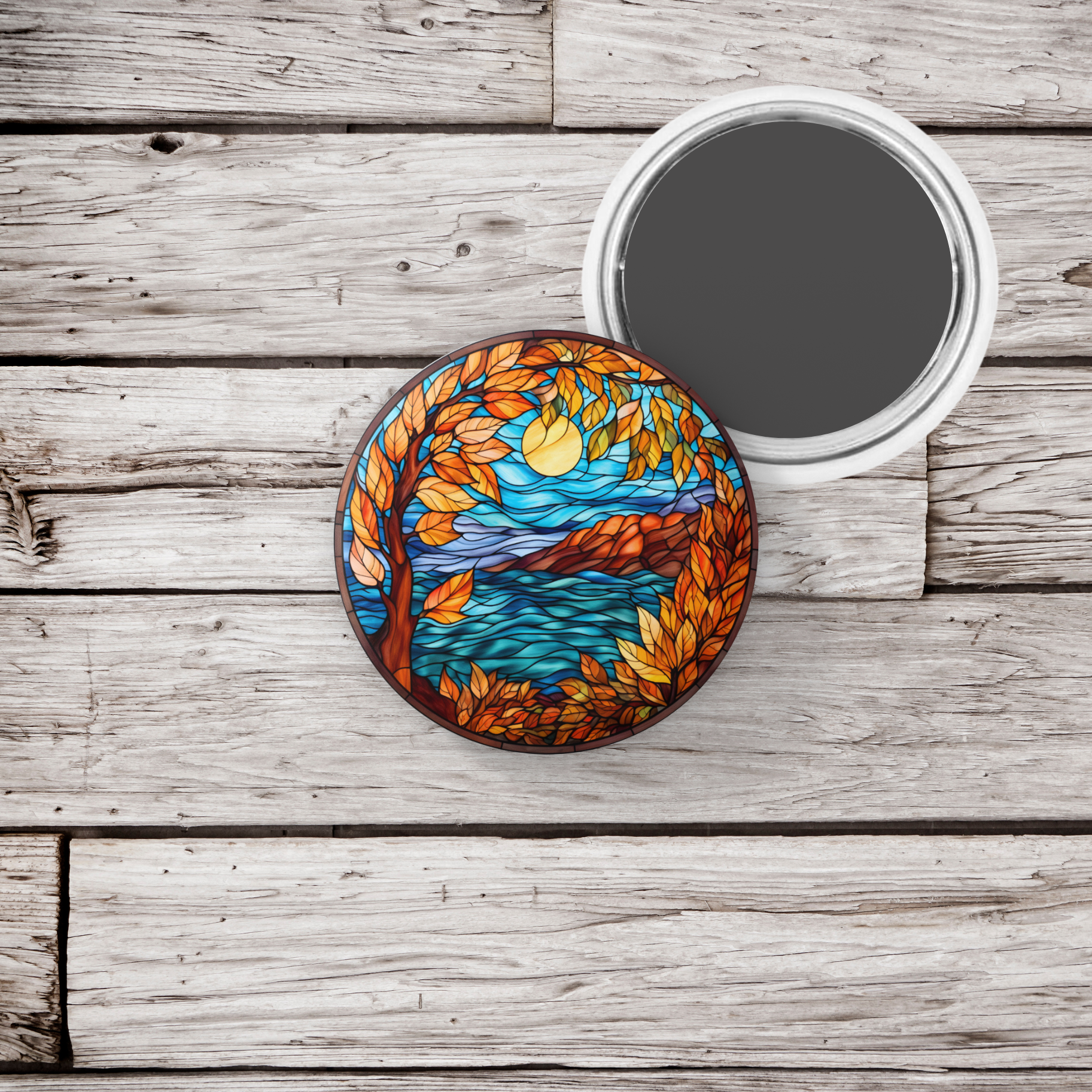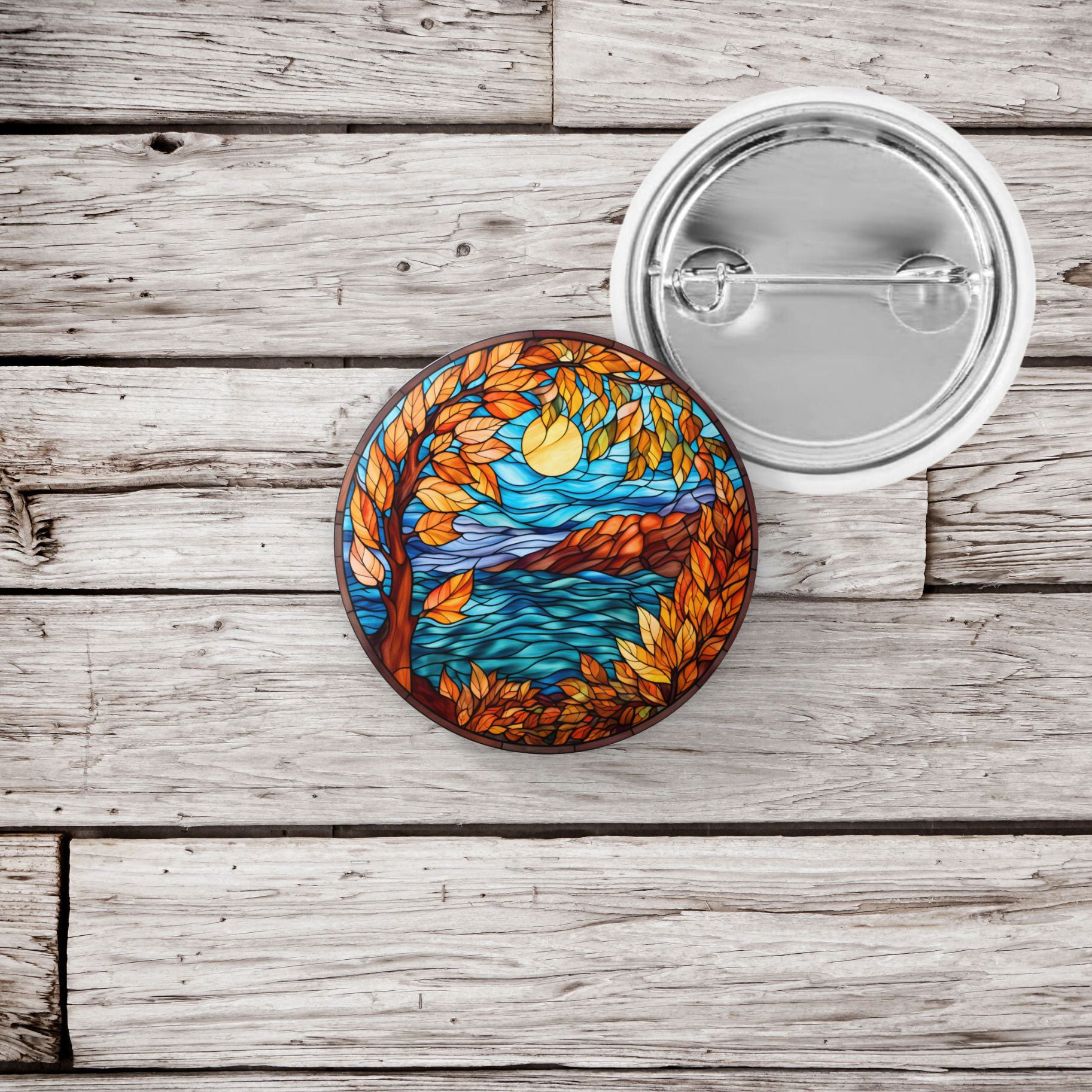 Stained Glass Fall Lake Pin Back Button, Magnet, Keychain