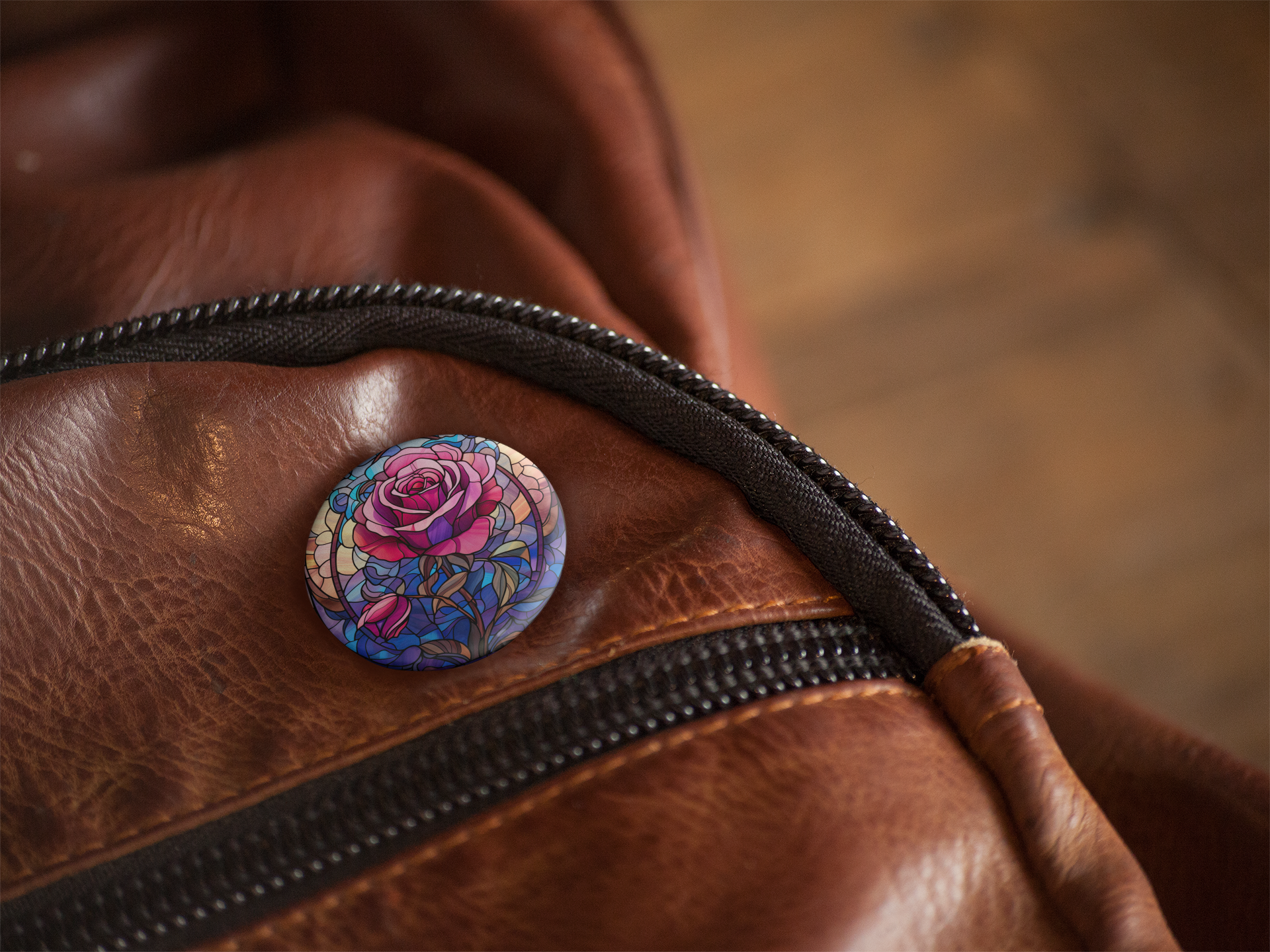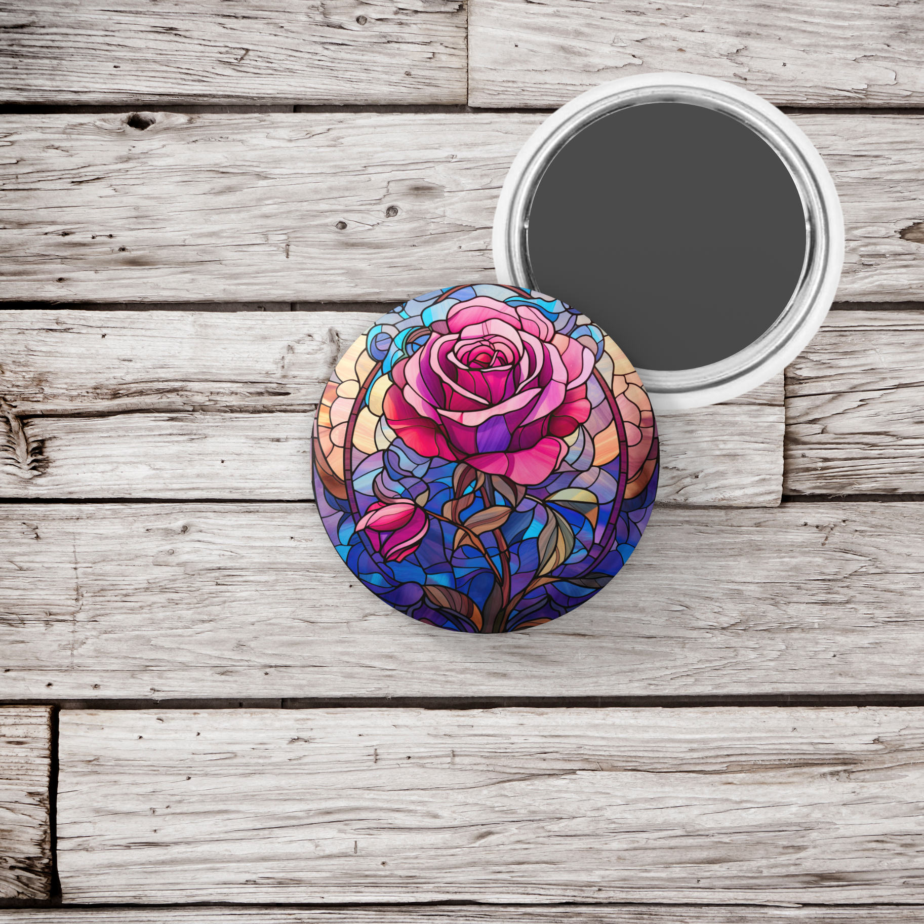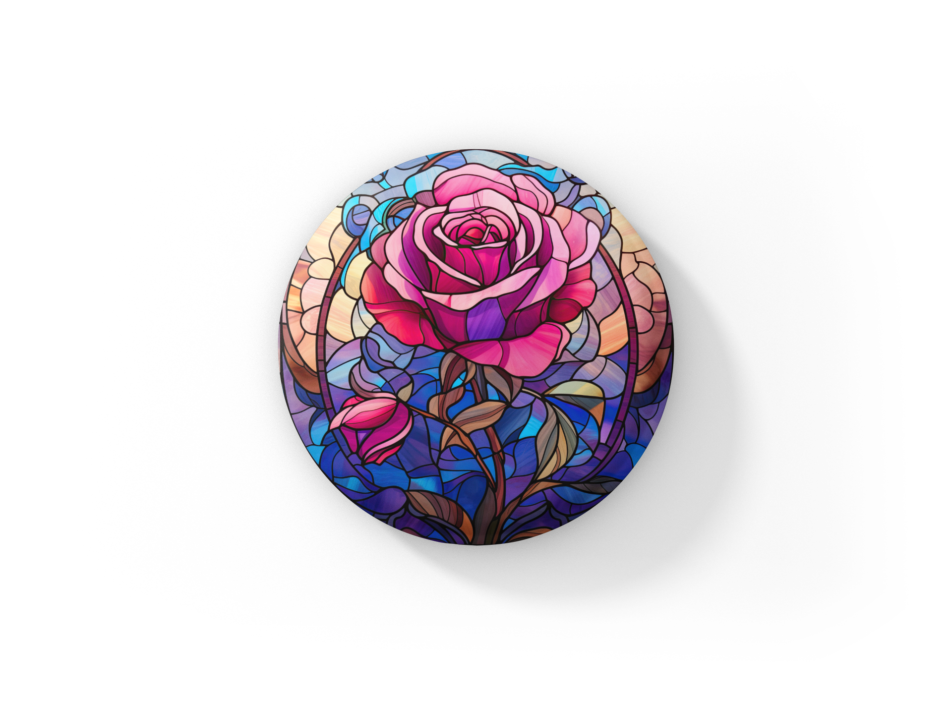 Stained Glass Rose Pin Back Button, Magnet, Keychain