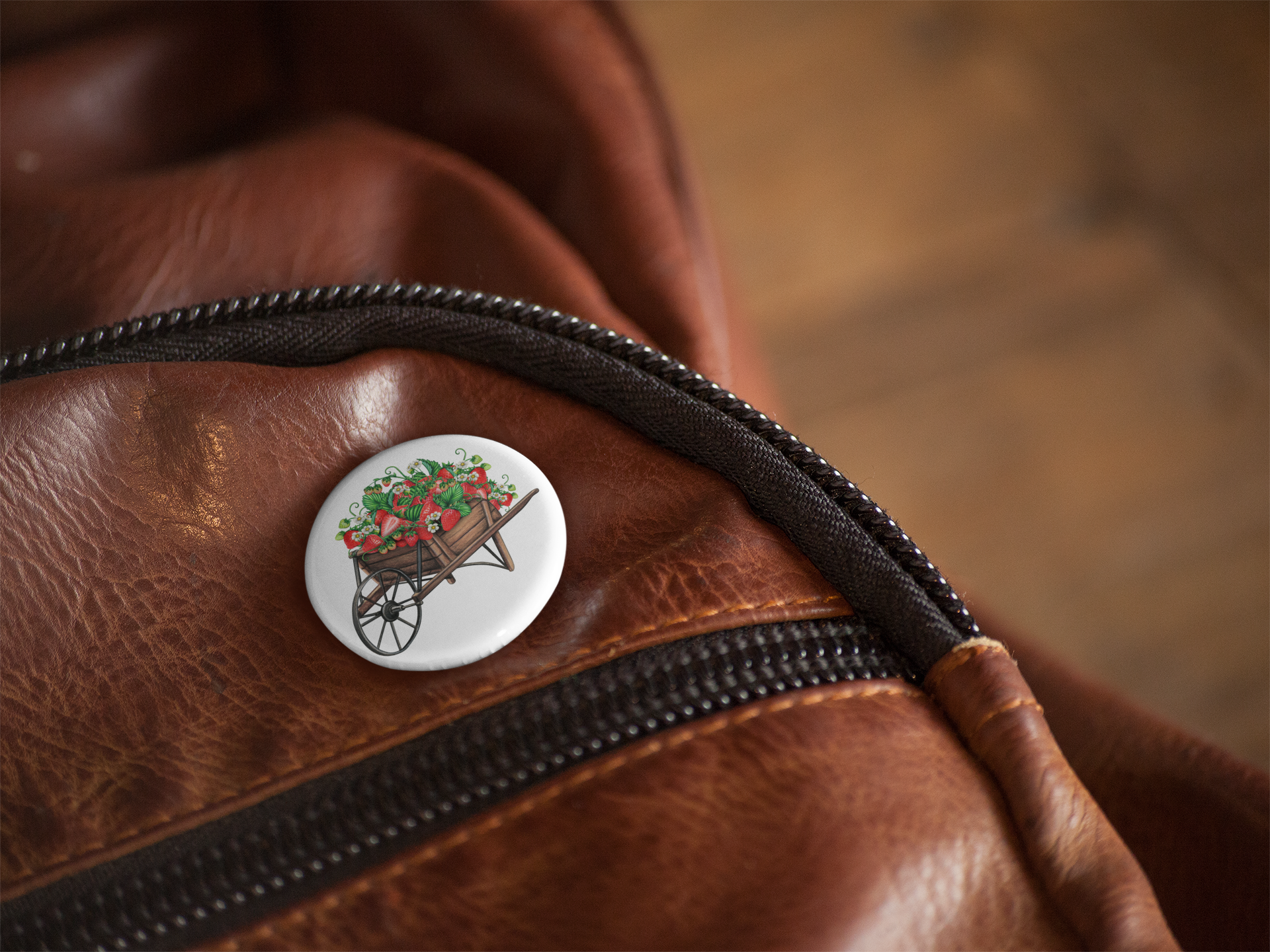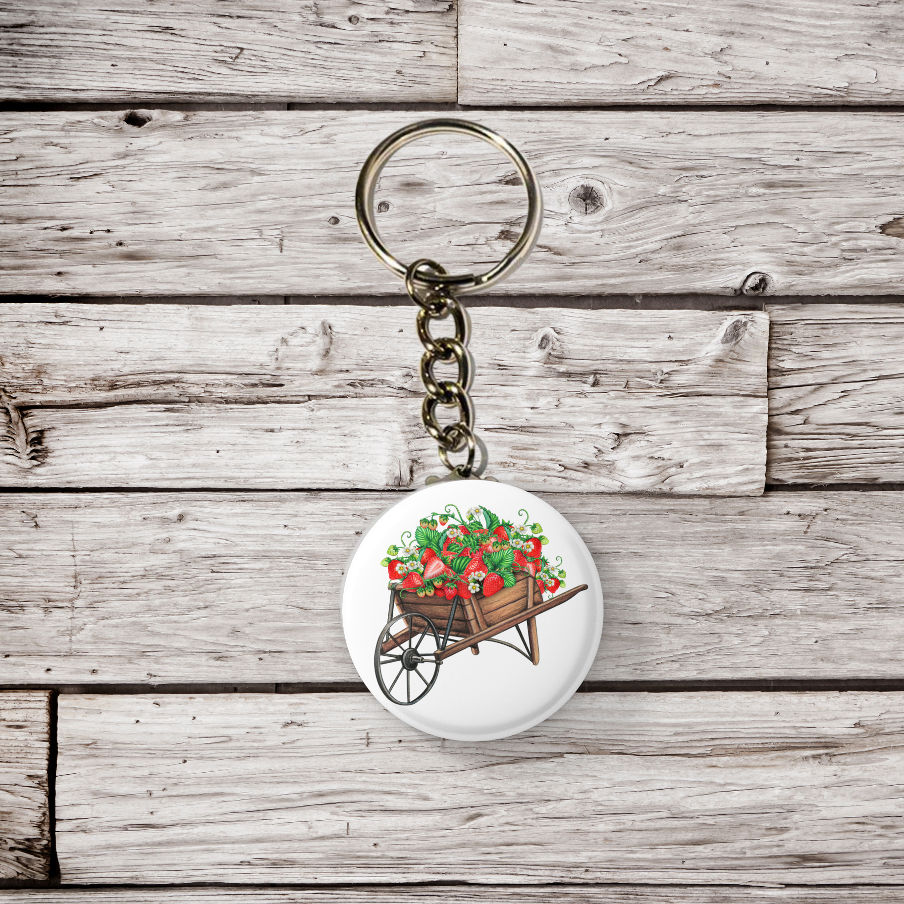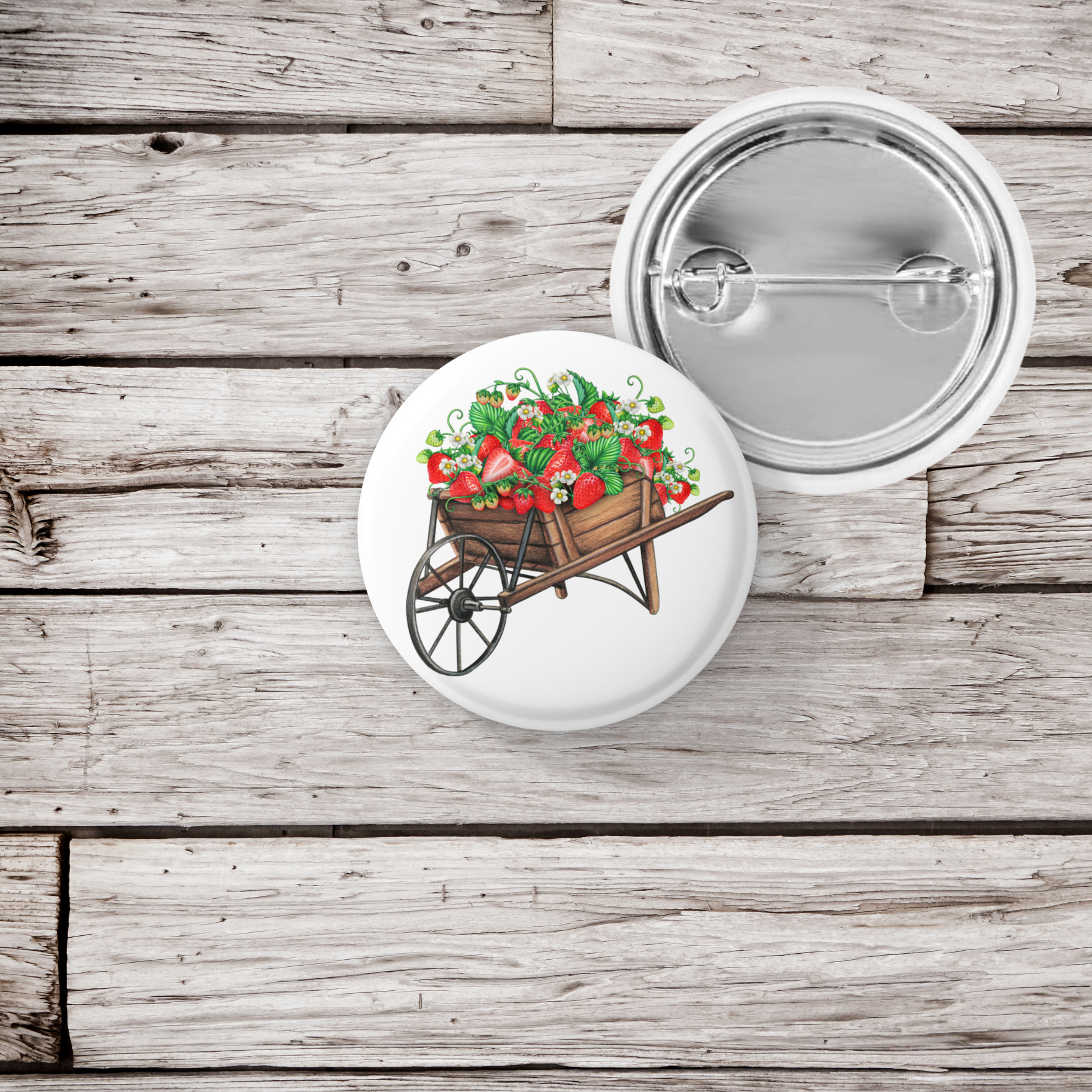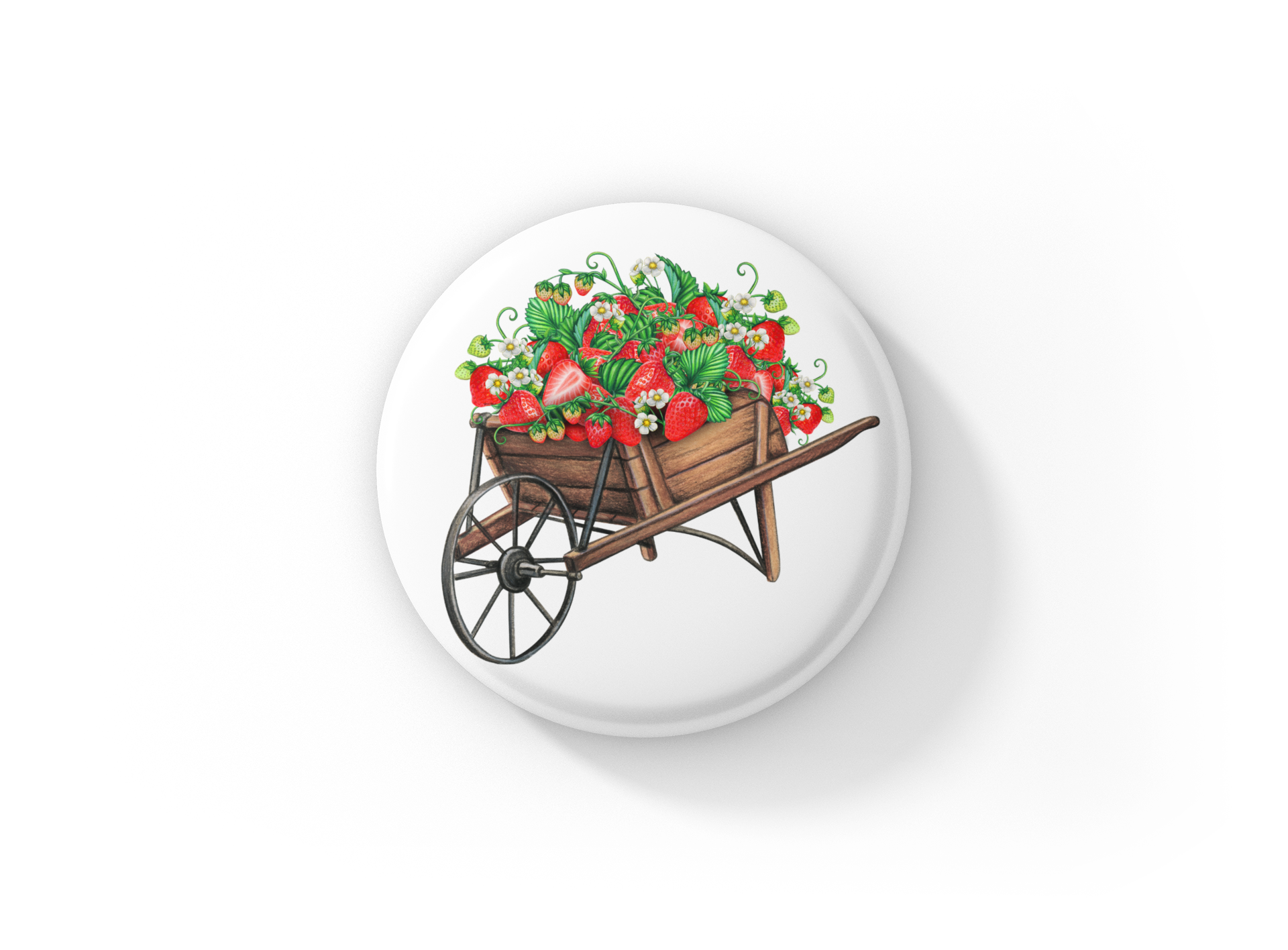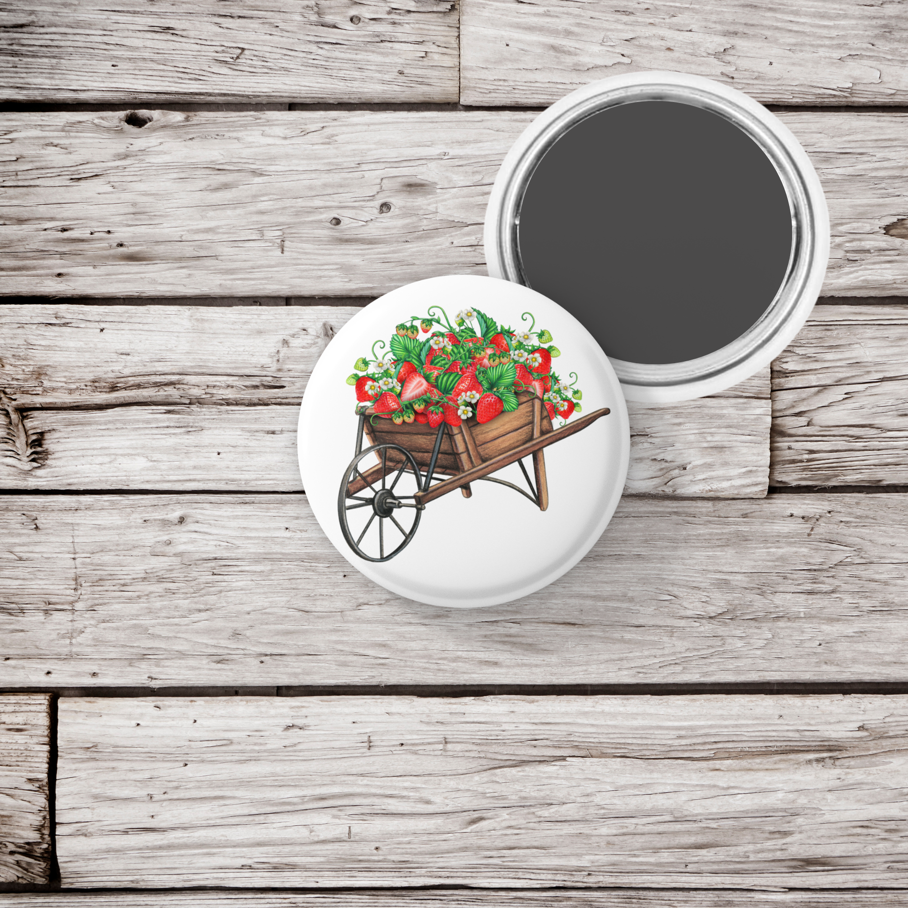 Strawberry Wheelbarrow Pin Back Button, Magnet, Keychain